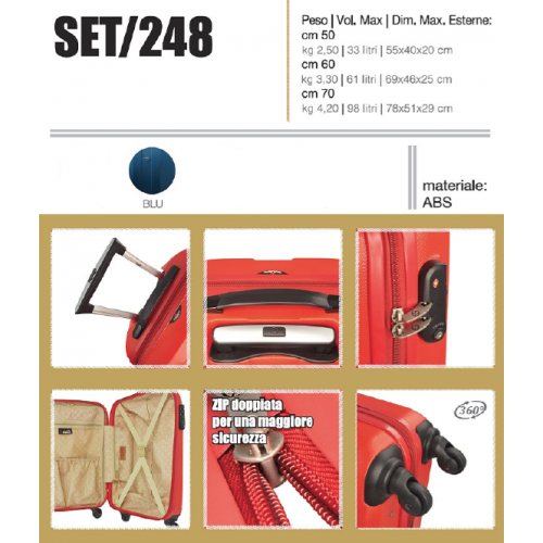 Set od tri kofera, od ABS materijala. Dostupan u plavoj boji, sa štitnicima od udaraca, sistemom za zaključavanje, kavalitenim ručkama za nošenje i mekanim tockicima koji se rotiraju za 360 stepeni.